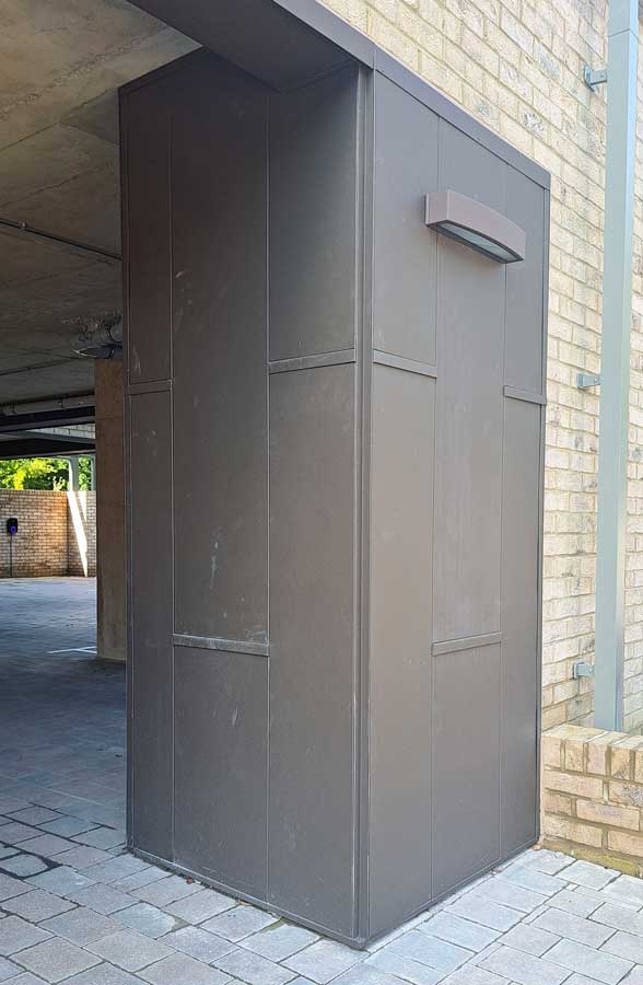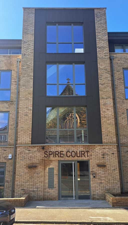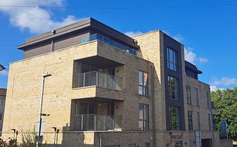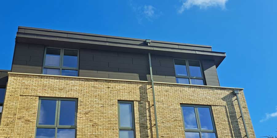 We used Prefa aluminium sidings to clad the top floor and stairwell of this apartment block in Tunbridge Wells, Kent, working for main contractor Wedgewood Homes.