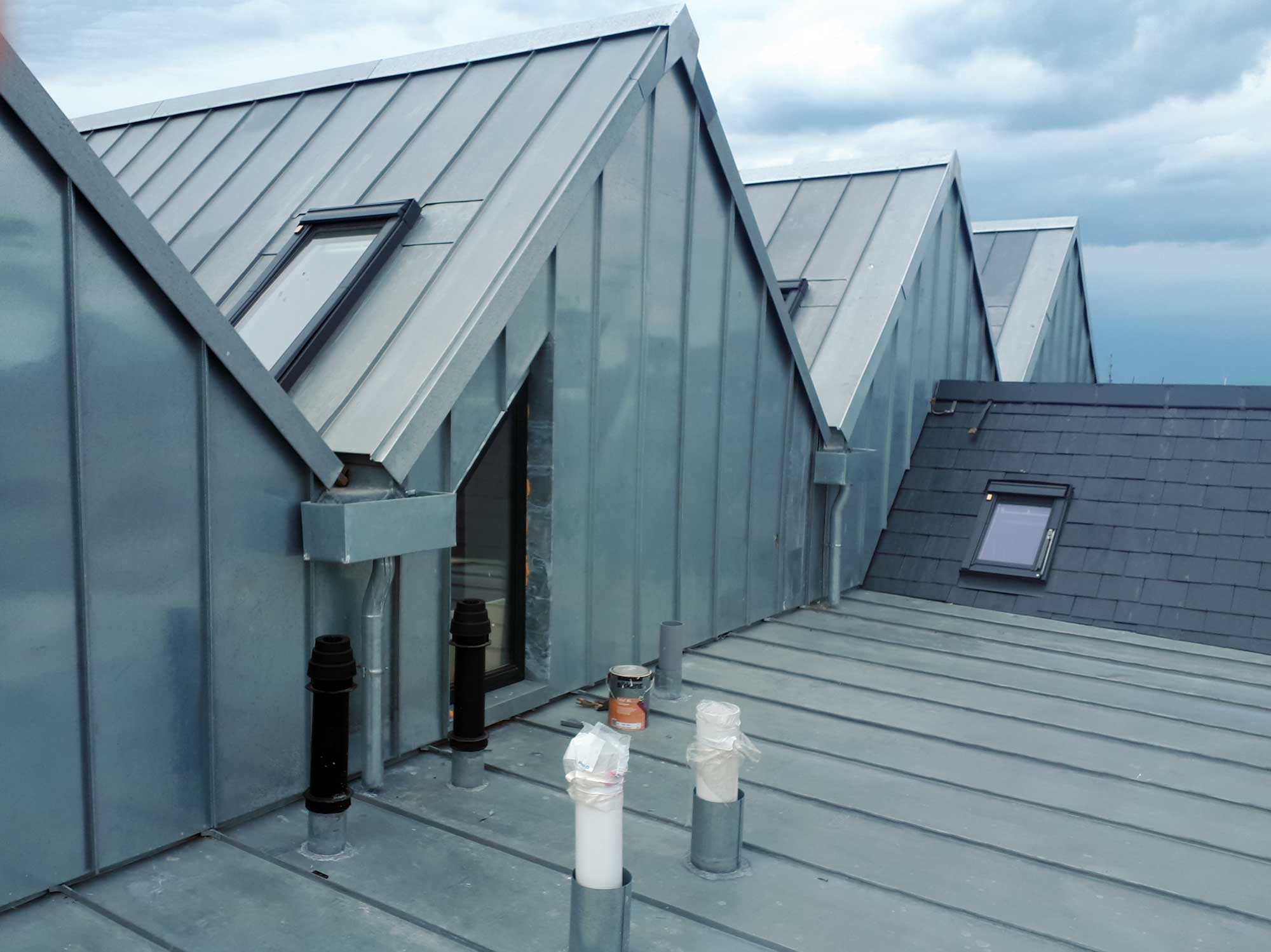 Natural zinc is used 0n these flats built on the seafront at Whitstable in Kent, . The earlier photos here show the zinc in its early bright appearance but the later ones show the effect of weathering where the zinc has developed the protective patina that ensures its longevity.