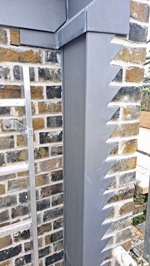 In the historic centre of Rochester in Kent, yards from the castle and the cathedral, a new storey was added to this detached house. Walls and roof to be clad in zinc. To allow ventilation under the zinc above a valley gutter that could not be sunk into the roof, we installed these zinc hoods over a series of air inlets.