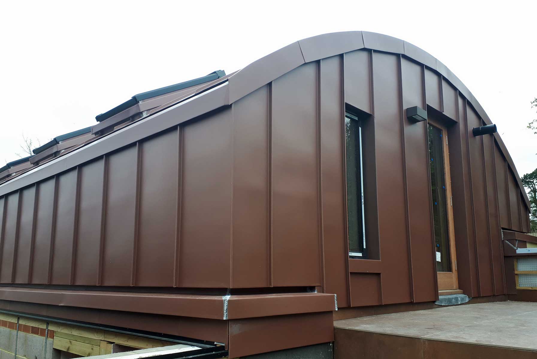 A two-storey garage/studio extension in the East Sussex countryside with a barrel-vaulted roof which shows off the distinctive colour of the VM Pigmento Red Zinc.